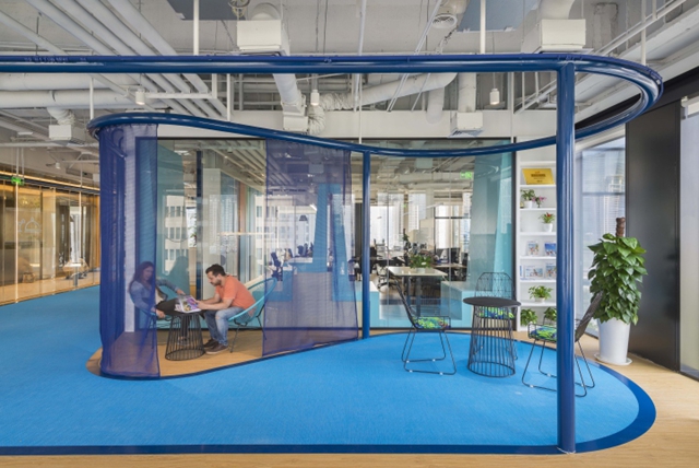 本案是旅游公司的辦公室裝修設(shè)計(jì),室內(nèi)空間更偏向于年輕而新興,整個(gè)空間都是海藍(lán)色,為了讓這種視覺(jué)淋漓盡致的呈現(xiàn),深藍(lán)色的高架管道沿著大廳周?chē)h(huán),劃分了大廳區(qū)域內(nèi)不同的小區(qū)域,地毯的顏色和海浪般的邊緣看起來(lái)像海面,透明的玻璃材質(zhì)則像是陽(yáng)光,可以反射進(jìn)深處的空間,所以在光線上起到了輔助效果。